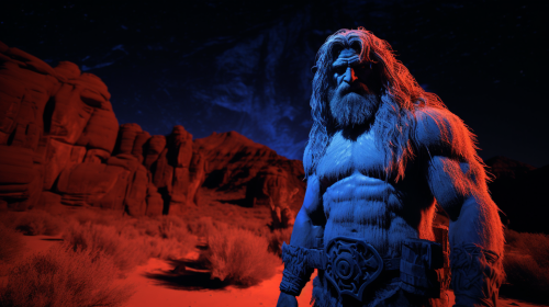 FLIR thermal image of a tall muscular giant with long red hair and beard on a desert rocky ridge at night,facing forward,realistic --ar 16:9