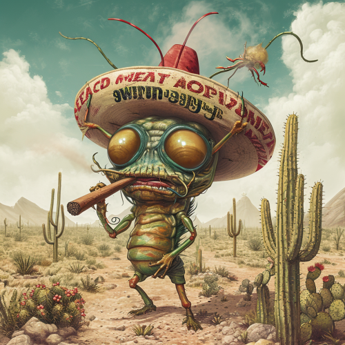 giant insect larva in desert wearing sombrero with the words MEXICAN MUD BAND" are printed on it. He has a mustache and smokes a cigar. --v 6.0