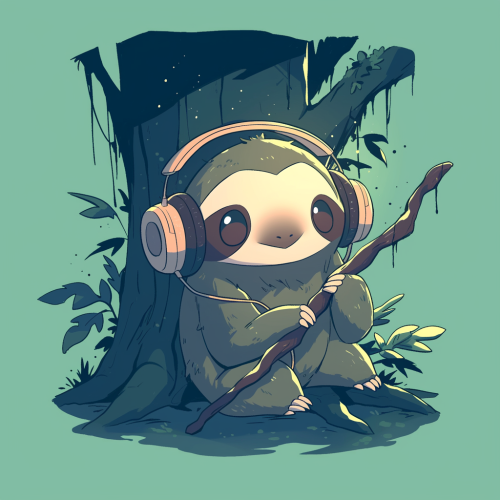 Create a menacing sloth with chibi proportions inspired by The Blair Witch Project. The sloth has a sloth-like face with dark, twisted features, and it lurks behind a tree in a dark, haunted forest. The sloth holds twisted, cursed sticks, and its headphones are styled with dark, unsettling forest-themed patterns. The sloth’s presence is ominous, as if it's watching you from the shadows, waiting to strike. --niji 6