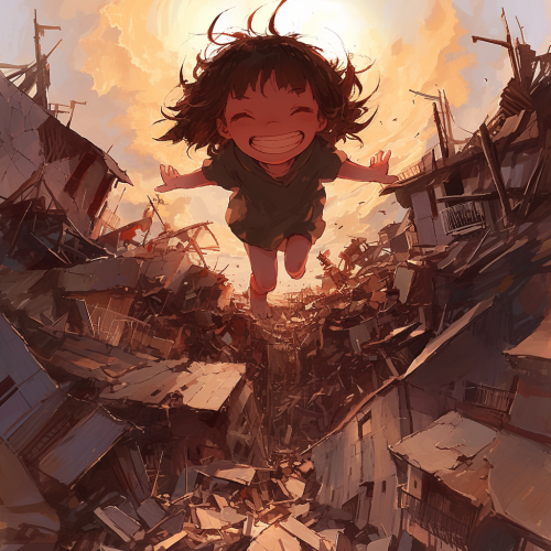 a giant child with a huge smile, stepping over tiny buildings, destruction, movie, anime, surreal, --niji 6