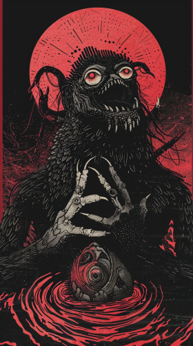hand drawn style image with dominant black and red colors, highlighted, spiritual being, body of a sloth, one eye on the head, fingernails and toes big like a sloth, giant mouth on the belly, spiritual atmosphere, hand drawn style, focus on every detail, sharp details, high quality, high quality graphics, 4k, artstation --v 6.0 --ar 9:16