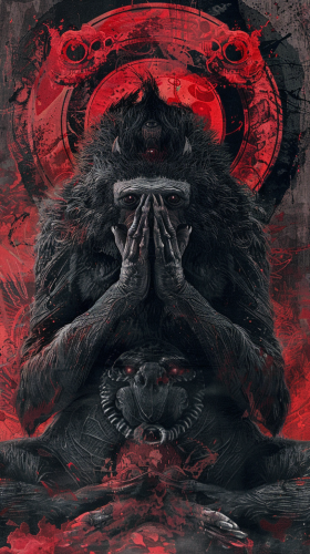 hand drawn style image with dominant black and red colors, highlighted, spiritual monster, one-eyed sloth on its head like a cyclops, big fingernails and toenails like a sloth, giant mouth on its belly, spiritual atmosphere, hand drawn style, focus on every detail, sharp details, high quality, high quality graphics, 4k, artstation --v 6.0 --ar 9:16