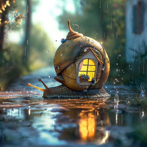 pixar style, disney style, cartoon style, giant snail which has a house hanging by straps on the shell, the snail is in the rain, the snail is placed on a wet ground with puddles, there are reflections in the water of the scenery, there are splashes of water surrounding the snail, raw style --v 6.0