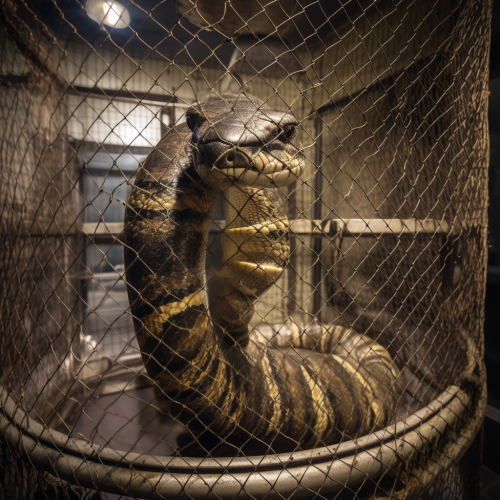 a giant snake monster that has arms with webbed hands (like a dragon) within a large and round sandy, stone room - rearing up and hissing - hyper realistic and adventurous --ar 16:9