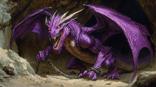 An adult purple void dragon in a cave, purple scales, purple flames all over body, metal blinder over eyes, wings bound, metal chain around neck, roaring, in the style of a 1980's fantasy art painting, D&D, --ar 16:9
