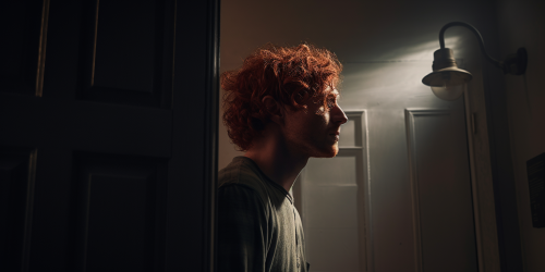 a man with curly ginger hair stood by his front door in the hallway, back against the wall, looking up, photo-realistic, cinematic, --ar 2:1