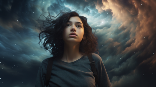 dark-haired teenager staring at camera, galaxies swirling around, surreal scene, clouds, dreamlike, genesis, paradise, --ar 16:9 --v 5.2