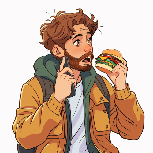 a man is late, has a lot of thoughts in his head, speaks on the phone while eating a sandwich, puts on his pants with the other hand in a cartoon style on a white background --v 6.0 --s 250