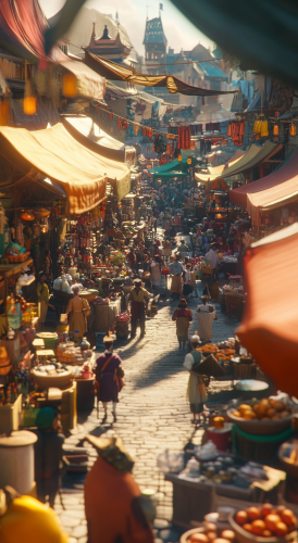 yper-realistic depiction of the Glacial Market, a bustling mini marketplace set near the entrance of the Free Company house. The scene captures a lively winter festival market atmosphere with icy stalls crafted from frosted wood and stone, adorned with twinkling lights that hang above like sparkling stars. Each stall is filled with various goods: handcrafted jewelry, glowing potions, enchanted scrolls, and rare crafting materials, displayed on icy blue and white cloths that add to the frosty aesthetic. The ground is covered in a light dusting of snow, crunching softly underfoot as characters move between stalls. Lanterns in the shape of snowflakes are scattered around, casting soft, bluish light that creates a magical glow, enhancing the wintery theme. Frost-covered barrels and crates are stacked near the stalls, brimming with supplies, while small bonfires crackle nearby, offering warmth and adding a cozy contrast to the cold environment. Characters of various races--Mi'qote, Elezen, Lalafell--bustle about, engaging in trade, crafting, and socializing. You can see artisans working on new creations at portable workbenches, their breath visible in the cold air. The market is filled with a mix of sounds: the chatter of bartering, the clinking of coins, the soft rustle of cloaks, and the distant ringing of bells, adding a festive touch. The sky above is a blend of twilight blues and purples, with gentle snowfall creating a serene, almost dreamlike quality. Ambient light sources reflect off the ice, creating shimmering reflections that dance across the stalls. The atmosphere should feel alive, dynamic, and inviting--a perfect blend of commerce, camaraderie, and wintery magic. Use high-definition textures for the icy surfaces, realistic lighting effects to capture the [...]