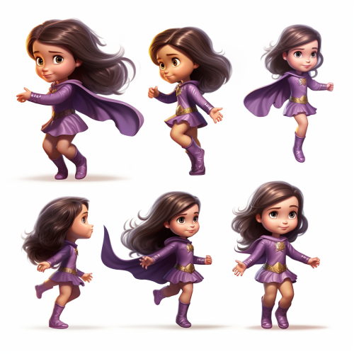 An adorable 3 Year old girl with straight dark brown hair, wearing purple superhero outfit and glowing purple magic. Multiple poses and expressions, different angles, character sheet, in the style of children's book illustration , isolated on white background –ar 16:9