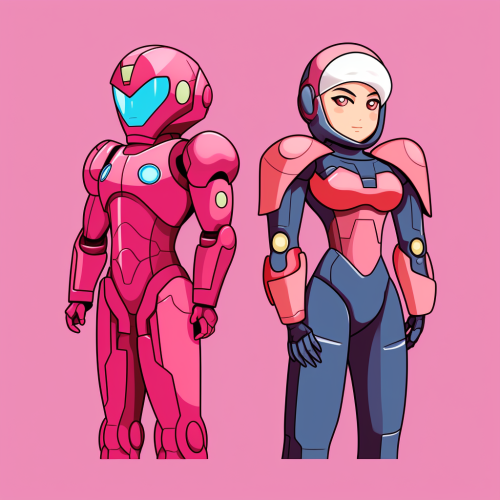 hijab megaman & ironman suit design look alike, pinkish color, full body, scifi, futuristic, simple minimalist, pixar style, concept art hand drawing.
