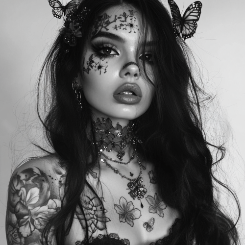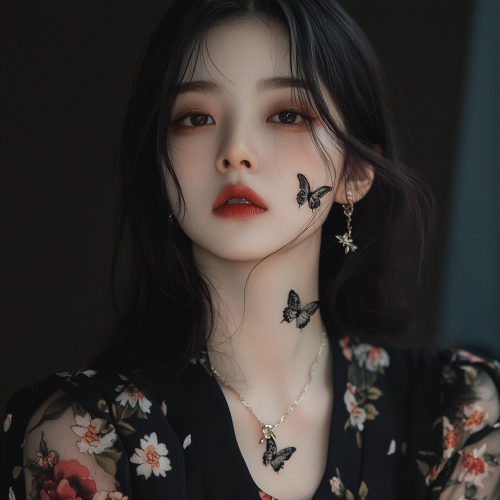 orean girl with flowers and small butterfly black tattoos, half body, beutiful, tattoos are fineline and beutiful, winter theme, entire head is showing