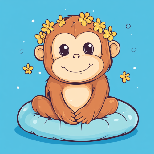 Cartoon flat style of a cute orangutan sitting on a soft pillow drawn in simple lines. The background is blue and the animal has small flowers on its head, which makes it look cute.