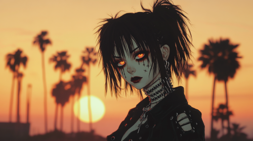 : a colourful skull girl brushing her hair in front of a mirror in a manga-style