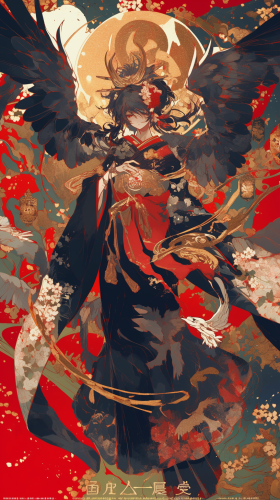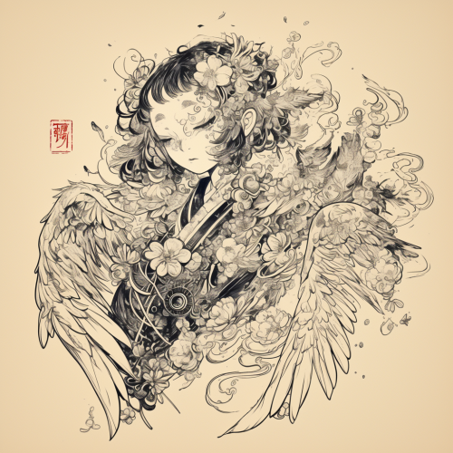 h tattoo drawing of a japanese girl fused with a bird, sorrounded by flowers and talismans, wings, feathers, classic japanese, dramatic, sad, dynamic composition, complex illustration, complex details, handrawn, lineart --niji 6