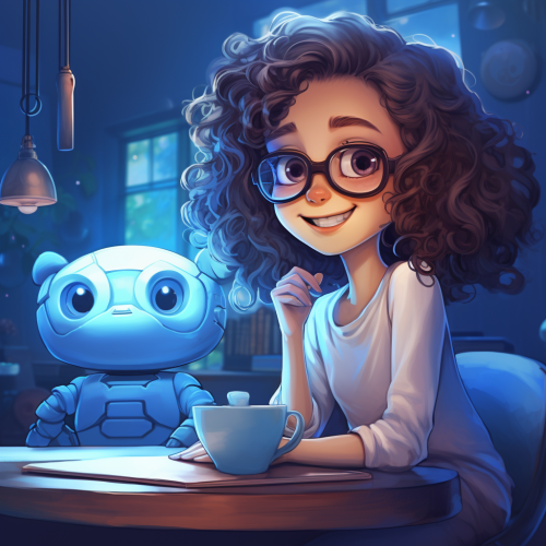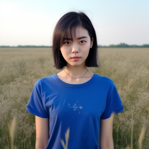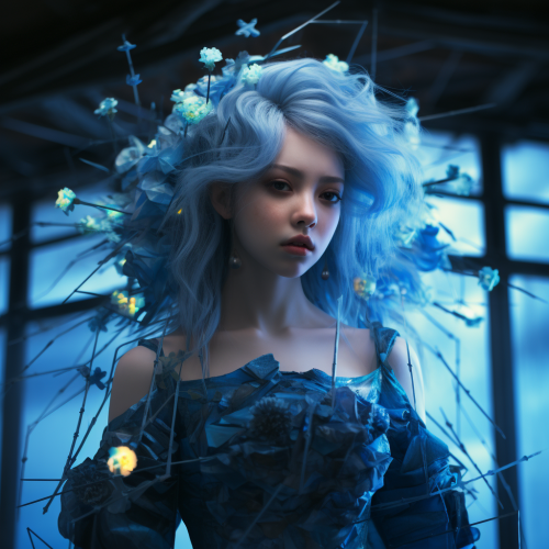 14 years old girl in full length, translucent, artificial intelligence, blue hair, wind flowers around