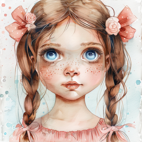 A girl with blue and pink hair, red cheeks, white dress, holding flowers in her hand, in the style of manga, colorful ink drawings with light gray and dark cyan tones, half body portrait with a white background, in . --ar 105:128 --v 6.1