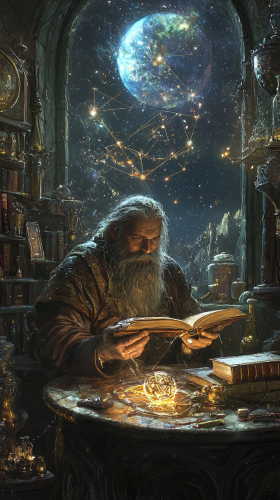 Un alquimista de barba larga se inclina sobre una mesa de mármol, llena de frascos, libros antiguos y sÃmbolos arcanos. De sus manos emergen hilos de energÃa dorada, conectándose con un orbe flotante en el centro de la sala. A su alrededor, se ven estantes llenos de pociones y artefactos mágicos, iluminados por una luz cálida que emana de velas antiguas. El alquimista está envuelto en una túnica de terciopelo oscuro con bordados dorados, cada hilo finamente detallado. En el fondo, un gran ventanal deja entrever un cielo nocturno lleno de estrellas y constelaciones en movimiento. El estilo es altamente detallado, con texturas ricas y un juego de luces y sombras que resalta la atmósfera misteriosa y encantadora del lugar, similar a una obra de la pintura barroca con toques fantásticos. --ar 9:16 --q 2