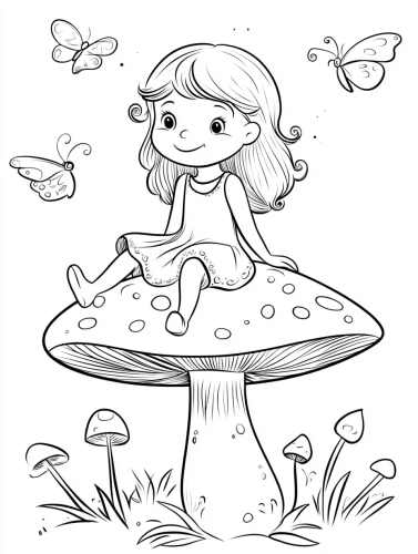 coloring page for children, easy, white background. no clutter. black and white, no gray, a girl riding on the back of a giant butterfly. --ar 3:4 --style raw