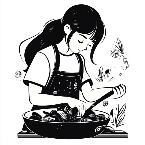 a girl cooks mussels, an icon in the style of ancient Slavic style, featuring Roman mosaic patterns, designed in the style of Tim Burton, white background, with bold outlines and geometric shape, only black and white, with simple details --ar 89:62 --q 2
