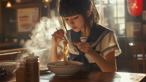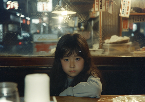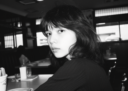 Japanese tween model girl.An old restaurant.Photo taken with a toy camera in 1980. Black and white photo.photogenic, --style raw --v 6.0 --aspect 7:5