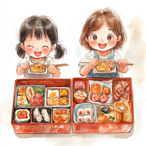 Japanese kids eating and smiling, ,make it look realistic and no jewelery on kids, kids should look from lower middle-class family, The kids are eating bento from different plates each