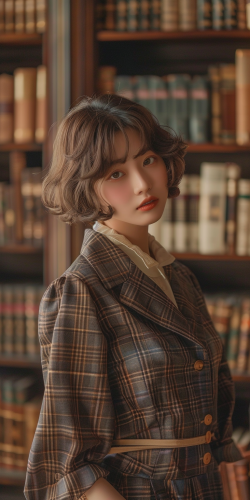 Full body photo. 18 year old very cute Japanese fashion model. She is wearing fashionable luxury brand clothes. She has short hair and a hair color that matches her clothes. Background is a magical library. Lots of books, high quality. canon EOS R6. shooting pose: high fashion pose] --ar 1:2 --style raw --v 6.0