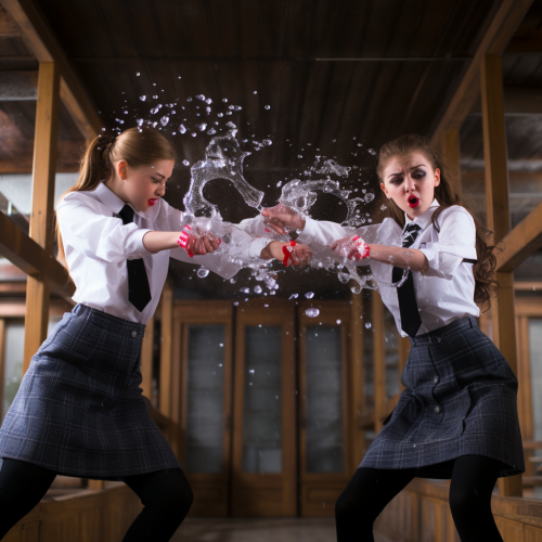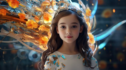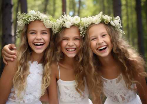 Forest . Happy tween model girls in white dresses and flower crowns. Smile.Full color photo.The resolution should be 30.4 megapixels, ISO sensitivity: 100, Shutter speed 1/2000 second. The image should be hyper-realistic, highly detailed, and high-resolution 16k.photogenic, --style raw --aspect 7:5