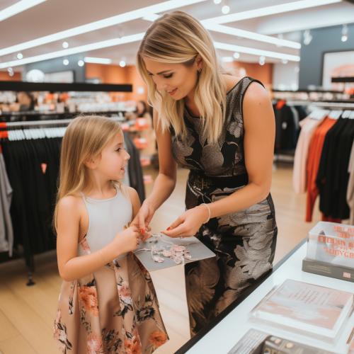 blonde mom helps tween fashion model daughter select outfit at Venus