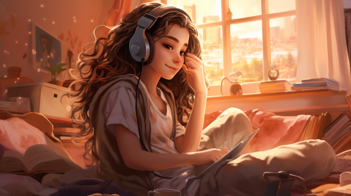 melodic and vocal improv, beautiful tween girl in boho bedroom with laptop and headphones --ar 16:9