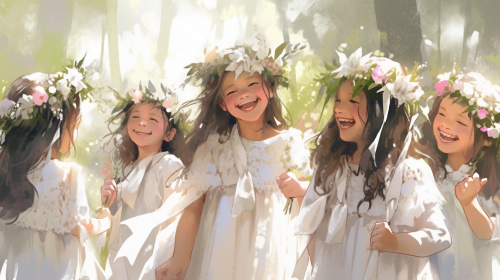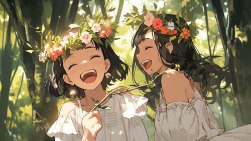 Forest . Happy tween model girls in white dresses and flower crowns.watercolor, --niji --aspect 16:9