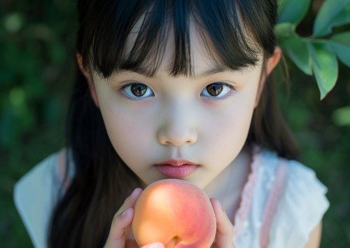 Girl eating a peach Japanese tween model