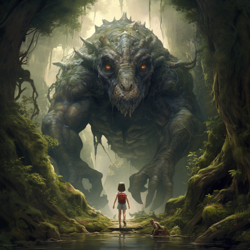 A giant in a magical forest looming over a little girl wear cream color dress, detailed fantasy painting