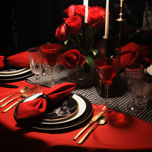 dinner date tablescape with a mafia/sopranos twist. Oppulent reds but with a cool edge that appeal to a gen z audience