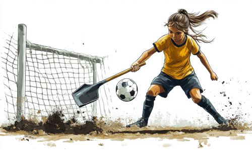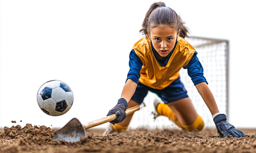 12 year old girl using a shovel to guard a goal in a action pose with a soccer ball heading toward the goal. no background. blank background.image is centered. in a gold and dark blue jersey. i want the soccer field to look like it is dug up jsut a little bit. high resolution. very defined. make the girl look athletic and biraicial. wide screen for a soccer banner. cartoon style. flat art. illustrated. --ar 5:3