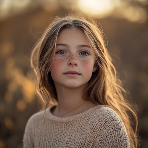 A portrait shot of a 12-year-old girl with a chubby body, looking directly at the camera, with vibrant colored hair, in a cozy living room, soft and warm atmosphere, with sunlight gently filtering through the curtains, shot with a Nikon Z7 II, 50mm f/1.4 lens, natural soft tones --ar 3:4 --style raw