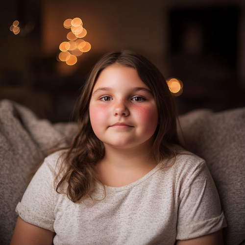A portrait shot of a 12-year-old girl with a chubby body, looking directly at the camera, with vibrant colored hair, in a cozy living room, soft and warm atmosphere, with sunlight gently filtering through the curtains, shot with a Nikon Z7 II, 50mm f/1.4 lens, natural soft tones --ar 3:4 --style raw