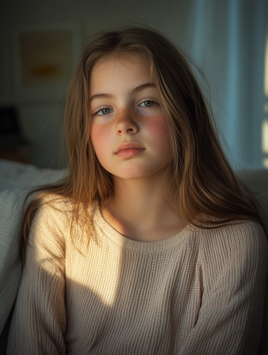 A portrait shot of a 12-year-old girl with a chubby body, looking directly at the camera, colorful hair, in a cozy living room, soft and warm atmosphere, with sunlight gently filtering through the curtains, shot with a Nikon Z7 II, 50mm f/1.4 lens, natural soft tones --ar 3:4 --style raw