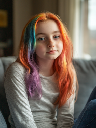 A portrait shot of a 12-year-old girl with a chubby body, looking directly at the camera, colorful hair, in a cozy living room, soft and warm atmosphere, with sunlight gently filtering through the curtains, shot with a Nikon Z7 II, 50mm f/1.4 lens, natural soft tones --ar 3:4 --style raw