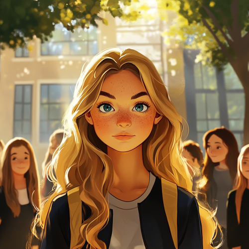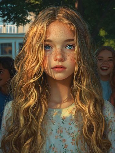 A digital painting of a 12-year-old girl standing in the foreground, feeling isolated, with long, wavy blonde hair falling over her shoulders, freckles on her cheeks, and complete heterochromia: one eye is a tropical blue-green, the other a light golden honey brown, both with intricate iris patterns. Warm, natural lighting with a soft glow around the girl, emphasizing her emotional state. In the background, a group of classmates is laughing, a school building with large windows, partially obscured by trees, is slightly blurred to keep the focus on the girl. Created Using: digital brushstrokes, painterly style, subtle painterly textures, detailed textures in hair and eyes, warm color palette, layered lighting, smooth color transitions, character-focused composition, animated film-inspired design, glibatree prompt, realistic yet expressive depiction --ar 3:4