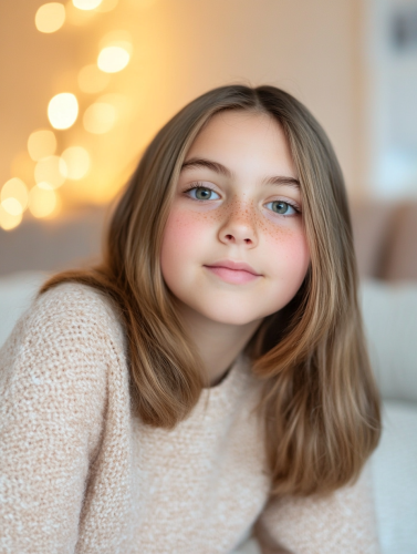 A portrait shot of a 12-year-old girl with a chubby body, looking directly at the camera, with vibrant colored hair, in a cozy living room, soft and warm atmosphere, with sunlight gently filtering through the curtains, shot with a Nikon Z7 II, 50mm f/1.4 lens, natural soft tones --ar 3:4 --style raw