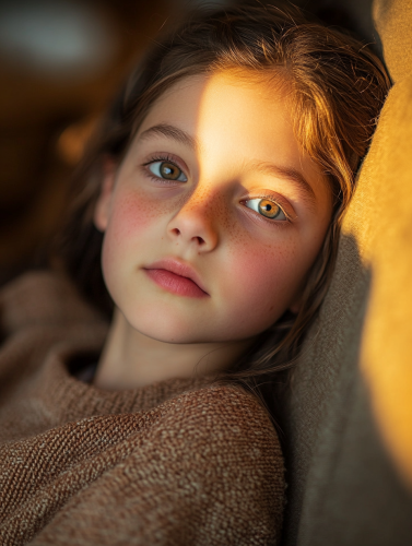 A portrait shot of a 12-year-old girl with a chubby body, looking directly at the camera, colorful hair, in a cozy living room, soft and warm atmosphere, with sunlight gently filtering through the curtains, shot with a Nikon Z7 II, 50mm f/1.4 lens, natural soft tones --ar 3:4 --style raw