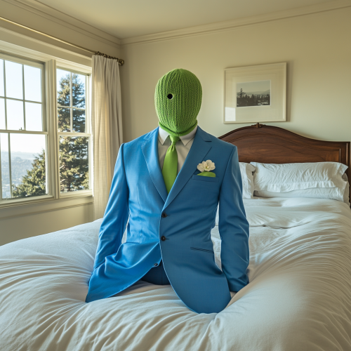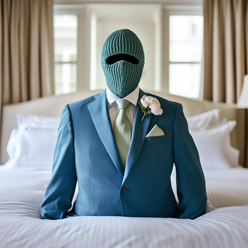 a bespoke bright blue men's suit is laid across a plush king size bed with white sheets. There are many windows in this large bright room, and there is a peony flower on the top left pocket of the suit on the bed in the middle of the room. A knitted, bright green ski-mask (with the typical 3 holes) is laid down flat on the bed, at the top of the suit, to make it look like a full deflated person.