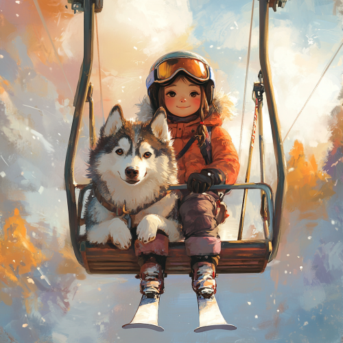 a little girl, about 10 years old, riding on a ski lift chair, wearing a cute and girly ski suit, with a furry hood, wearing skis and holding her poles. Her big husky is riding with her, he is wearing googles, a ski suit and ski boots. The little girl is wearing her goggles on her head, allowing for her beautiful big brown eyes to show, she is light skinned with rosy cheeks and freckles. The background shows other chairs on the lift behind them and a wintery, snowy, ski hill background. All in a kawaii - whimsical style.