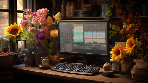 A room with beautiful flowers and 2 monitor showing charts for FX trading in the world of Dragon Quest.--v 5 --ar 16:9