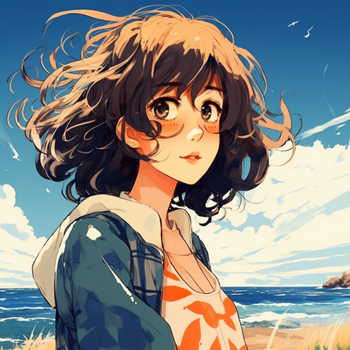 One girl,,Japanese Manga, Japanese cartoon style, cute face, at the sea, detailed illustration, Reiji Miyajima's drawing style, background, clothes and pose are randomly created,