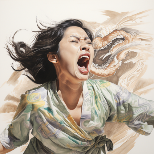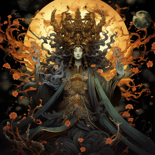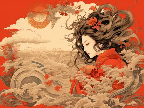 a girl with long hair is sitting on a tatami mat, there is a microphone in front of her for a podcast, around a creation from Japanese mythology, a picture in the style of a bright illustration, in acid colors, a lot of details, Japanese style, Japanese traditional elements, many bright colors, absurd, many elements, bright, strange, every element of a pic is in a circe on a white backgraound, logotype --v 6.0 --s 250