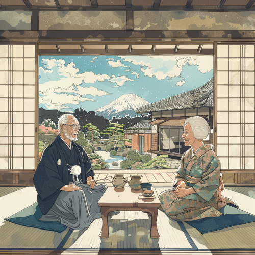 a girl and a boy both with cut hair is sitting on a tatami mat, there is a microphone in front of them for a podcast, around are creations from Japanese mythology, a picture in the style of a bright illustration, in acid colors, a lot of details, Japanese style, Japanese traditional elements, many bright colors, absurd, many elements, bright, strange --v 6.0 --s 250