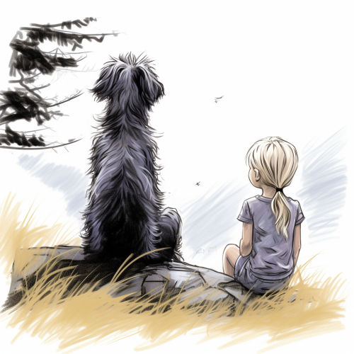 blond baby girl and miniature schnauzer under pacific northwest tree in a rocky meadow, a raven is in a tree, it's looking at them. rough sketchy crayon drawing, childrens book, cartoon, white background