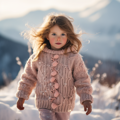 4 years old cute little girl is walking in a arctic dream land. Full body image. Snowy mountains in the background. Girl is having really messy hair and cute colorfull pastel sweater. Her hair is full of snow. It is snowing alittle bit. Warm inviting natural lighting, cinematic lighting, photorealistic, atmospheric, hyper quality, ultra realistic photo style, full details. Sky is pink and pastel.
